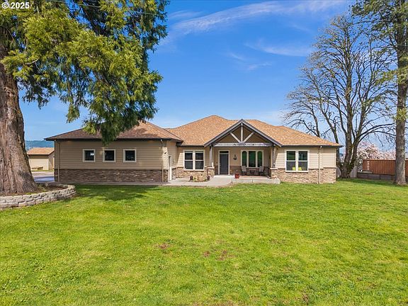 This stunning custom-built, single-story home offers the perfect blend of luxury, comfort, and convenience, designed with full ADA accessibility for ease of living. Situated on a spacious 1-acre lot, this home boasts high-end finishes and thoughtful upgrades throughout. The open floor plan features beautiful hardwood floors and a gourmet kitchen with Brazilian granite countertops, a large island with eating bar, ideal for both everyday living and entertaining. The expansive master suite includes a walk-in closet and a roll-in custom shower, providing a spa-like retreat. With three bedrooms, a dedicated office and 2.5 bathrooms, this home offers ample space for family and guests. The oversized garage and large mudroom add practicality, while the fenced yard offers privacy and a safe space for outdoor activities. Ample parking with a large concrete area, perfect for accommodating multiple vehicles, including RV parking with dump station. Enjoy recreational fun with the included basketball hoop, and space to add a future shop, offering endless possibilities for customization and expansionLocated just outside of town, this home enjoys the tranquility of country living, surrounded by Montinore Vineyard, Epler Blueberries, and a local nursery, creating a serene atmosphere. Step outside onto the sprawling deck and relax in the hot tub while taking in the breathtaking views of the valley, Mount St. Helens, and Mount Adams. Whether you're enjoying the peaceful surroundings or hosting friends and family, this home is the perfect oasis.