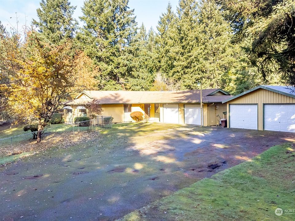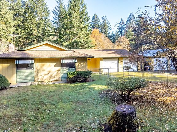 This home offers many attractive features. The rambler-style home features 3 bedrooms, & 2 baths. Freshly painted with new carpet, updated kitchen and baths. The hot tub room has a kitchenette that leads out onto the covered patio area. There is an attached 2-car garage, with an additional detached 2-car garage/shop + a large storage shed with a loft. Ideal for those needing extra workspace or storage for vehicles. This private rambler sits on 3.11 acres and offers a desirable combination of location, space, amenities & potential for personalization, making it an appealing property for those seeking a comfortable & versatile living environment. Conveniently located just minutes away from I-5, Costco, shopping, parks, schools & JBLM.