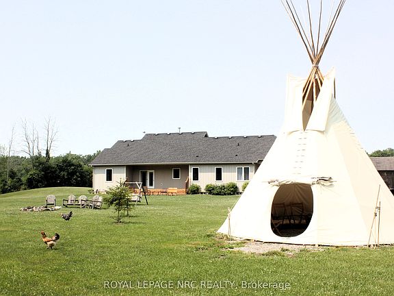 Perfect setting for nature enthusiasts, homesteaders, hunters, and mechanics, escape the chaos of city life to this one of kind rural property. This home was custom built by the original owners for a homesteading lifestyle and is situated on 37+ acres of mainly forested property. Features include engineered hardwood flooring and ceramic tiles throughout, 9' ceilings, large Pollard windows, wood burning fireplace in the living room, main floor laundry with adjacent shower room, and a separate dining room with patio doors to the covered rear porch. The primary bedroom features a walk in closet, electric fireplace, spacious spa-like ensuite with claw foot soaker tub and separate shower. An additional bedroom and den with French doors are located at the opposite side of the house with a 4 piece bathroom. Newer insulated 30x50 barn (2018) is a mechanics dream with a car hoist, hydro and underfloor heating. Outdoor features include covered front porch, covered and fenced rear patio area and covered rear deck, green house, farm shop (she-shed), 18' teepee with heavy duty canvas (2022), portable toilet, 2 fenced areas for animals, chicken coops, ponds, and a large garden area. The basement is currently used for storage, but has high ceilings and is suitable for finished space. There is parking for multiple vehicles and an attached double garage with concrete apron. Secondary access to the property from White Road. Convenient location central to Niagara Falls (12 min drive to new South Niagara hospital site), Welland (9min drive) and Port Colborne (9min drive).Whether you want to hunt deer and turkeys in your own forest, commune with nature walking the trails, go ATVing, grow your own food, raise livestock or simply enjoy living in a rural setting, this could be your opportunity to secure your place in agricultural zoning with a multitude of possibilities.