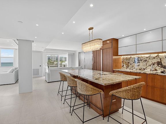 Coastal Luxury Living Redefined. Situated directly on the oceanfront, Residence 507 offers sophisticated living with uninterrupted ocean views from every room, including the primary bath. This fully integrated smart home captures the essence of coastal elegance, with two private balconies perfectly positioned for sunrise and sunset.The custom kitchen is the true centerpiece, designed for both function and entertaining, and appointed with Miele, Bosch, and Sub-Zero appliances, bespoke wood cabinetry, and an oversized island with seating for ten. Floor-to-ceiling glass doors frame the living space, creating a seamless connection between polished interiors and the breathtaking beauty of the ocean.