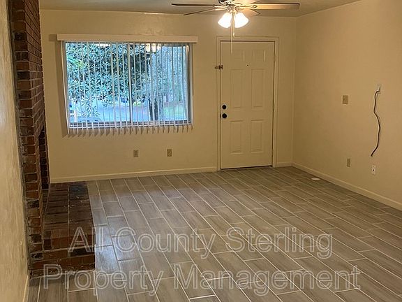 Classic brick fireplaceBrand-new tile plank flooringUpgraded light fixturesPrivate fenced-in patio