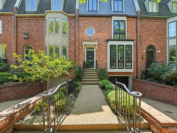 Nestled on prestigious Pershing Place, this elegant 3-story townhouse blends timeless design with modern convenience. A private tuck-under garage and oak floors throughout set the stage for refined living. The lower-level family room features a cozy fireplace, built-in cabinetry, and a full bath—perfect for guests or entertaining. The main floor showcases a formal living room with stacked crown molding, custom bookcases, a vented gas fireplace, wet bar, and box bay window in the dining room, complemented by plantation shutters and recessed lighting throughout. The second floor hosts a generous primary suite with ample closets and a lovely bath featuring a double vanity and shower. A second bedroom (currently used as a study), en-suite bath, and laundry complete this level. The third floor, crowned with a skylight, offers a spacious guest suite with window seats and full bath. Outdoors, enjoy a private garden retreat with stone paths, a fountain, irrigation, and landscape lighting. Just steps from the shops and restaurants of the Central West End, this home offers unmatched style and location.