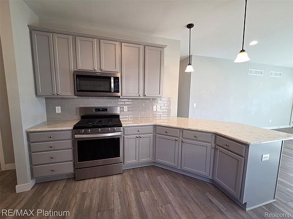 Stunning 2 Bedroom 2 Full Bath Ranch built in 2021 with Full Basement & Attached 2 Car Garage, offers the perfect blend of modern design and easy main floor living. The open floor plan features 9ft ceilings, luxury vinyl plank flooring in the main living areas and soft carpet in the bedrooms for added comfort. The kitchen shines with quartz counters, a gorgeous backsplash, stainless steel appliances, pantry and soft -close cabinetry that continues throughout the home (including the bathrooms!). The spacious primary suite offers a ceramic tile step-in shower, a quartz topped vanity, and a walk-in closet. Generous second bedroom with bifold closest steps from the second full bath & 2 hallway linen closets that offer ample storage. First floor also provides a full laundry room with a pocket door, making laundry day a breeze! Head downstairs to the partially finished basement with an egress window, extra space adds flexibility for hobbies, guests, or additional living space. Outside you can sit on the covered porch overlooking one of the community's open park areas with sun shades for enjoyment year round. The rest of the community is surrounded by mature trees, sidewalks, and a walking trail.