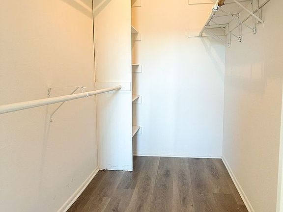 Private balconySpacious walk-in closetNew plank flooringGalley kitchenCarpeted bedroomElectric stove