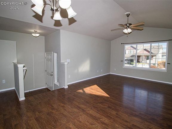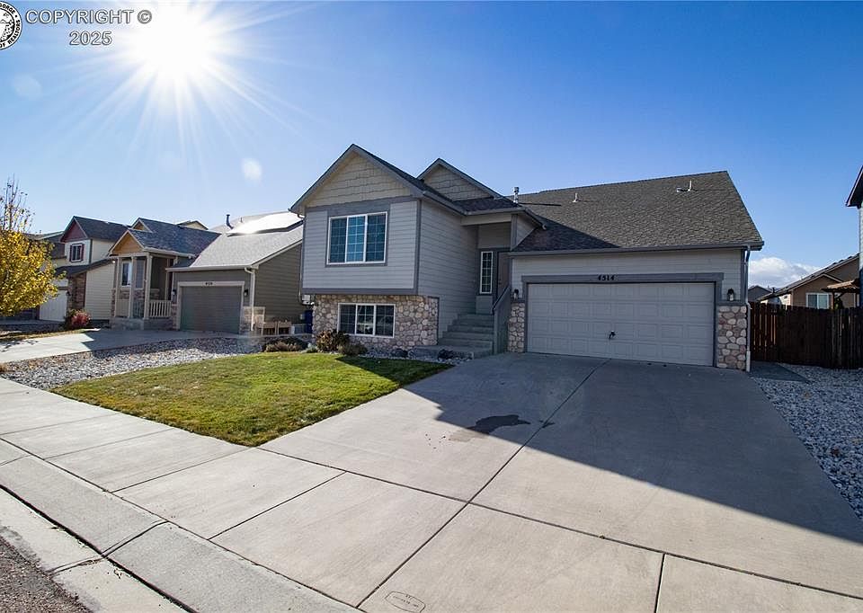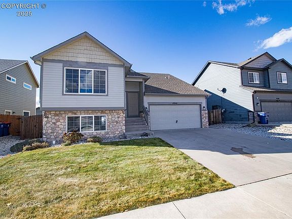 Fabulous 4-Level home in the Painted Sky at Waterview subdivision! This home has 3 bedrooms, 3 bathrooms, a large tandem, 3 car garage and 2,292 square feet of living space. Kitchen boasts solid surface countertops, tiled backsplash, and pantry . Frigidaire side by side refrigerator, Bosch dishwasher, stove and microwave are included. The primary bedroom features an adjoining full bath with a soaker tub and a walk-in closet. Lower level has spacious family /rec room and bathroom. Sliding door from family room opens to the backyard which includes concrete patio , privacy fencing and landscaping. The laundry room has a folding shelf and built-in cabinetry. Great curb appeal with a lawn and rock landscape design and faux rock accents. Amenities include central air conditioning, unfinished basement, and all bedrooms on the upper level are equipped with ceiling fans. Easy access to Ft. Carson, Amazon, the Airport, Peterson AFB and all the shopping, dining, and entertainment along the Powers Corridor!