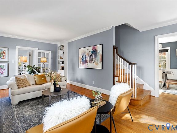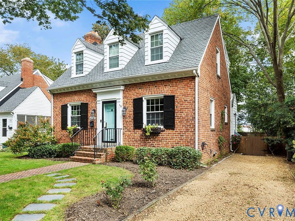 Welcome HOME! Come inside this Sauer’s Gardens Cape and be welcomed by the warmth of hardwood floors and a living room anchored by a brick-surround fireplace with the original mantle. Natural light fills the space, and a glass window door leads into a flexible office or reading room. The dining room, with its rich wall color, offers a bright setting that flows easily into the renovated kitchen. Here, cottage charm meets modern convenience with stainless appliances, painted cabinetry, and a stylish backsplash. The first floor includes a desirable bedroom with cork flooring and an attached full bath, perfect for comfort and accessibility. Upstairs, discover a spacious primary suite, a second bedroom, and a tiled full bath that blends elegance with functionality. Built-in storage systems, replacement windows, and a new 2025 water heater installed to ensure efficiency and ease of living. Outside, the fenced backyard is designed for both relaxation and entertaining, featuring a brick patio, mature landscaping, and a stately tree that anchors the setting. Whether hosting gatherings, gardening, or simply unwinding, this outdoor space is a true extension of the home. A private driveway provides off-street parking and the potential for a future garage. There is a 50amp outlet at the driveway for EV charging or RV hookup. Located near Willow Lawn, in the Mary Munford school district, with countless shops and restaurants, this home pairs character and convenience in one of Richmond’s most sought-after neighborhoods.