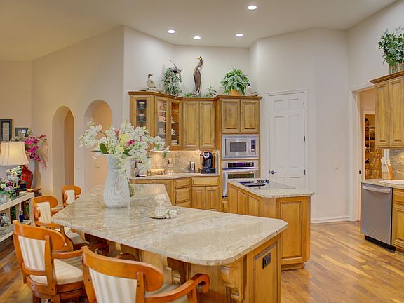 This custom built home is exceptional with quality & style. A one level open plan w/ Lg custom kitchen , granite counter tops, mega storage, SS appliances, wrap a round bar. The wide entry foyer opens to a view of the outside garden & patio area complete with a water feature & fenced yard. Lg primary suite ,walk-in closet, 2 private guest suites, exceptional Lg study/office/ library/bar, marble & hardwood floors, side entry over-sized two car garage w/ golf cart garage. The home is nicely landscaped w/ circle drive. The style is an Old World Mediterranean . A special feature of this home is the outdoor garden area. Furniture is not included but could be bought. Every piece is ornate & unique. A one owner home. Well maintained. Easy to show-Please call for an appt