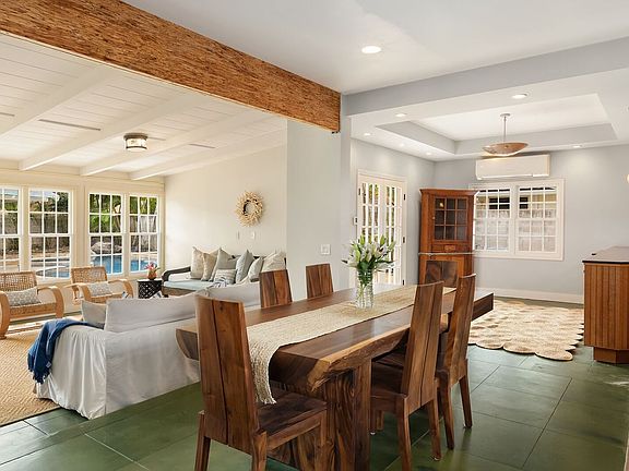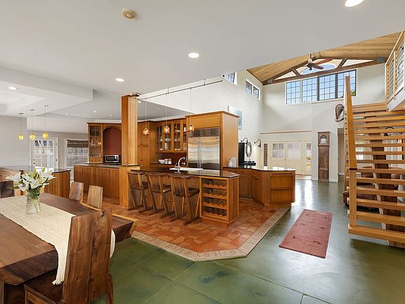 Tastefully designed with comfortable yet elegant decor, Kahala Seaside features an open concept living and dining space with polished concrete floors and peaked wood-beam ceilings. A floating staircase leading up to the furnished loft adds a modern touch.