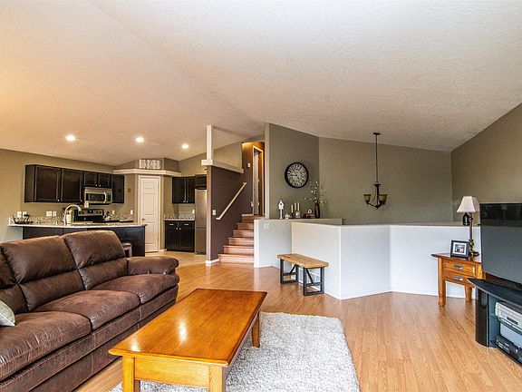 Low-maintenance home and yard on a quiet, centrally-located street. This modified split-entry/4 level plan cleverly fits 3 beds and 2 baths around 2 living spaces. Vaulted ceilings in the main floor great room concept with an open and updated kitchen. Large pantry, eating bar & informal dining are lead out to the north-facing deck that overlooks the private, fenced backyard. The primary bedroom is located in the daylight basement( full bath, double sinks & a walk in closet) next to the family room with a gas fireplace and laundry. Minutes to service and I-90, attached 2-car garage, sprinkler system, gas furnace with central air conditioning. This one is definitely worth a look!