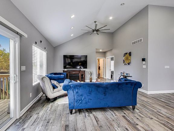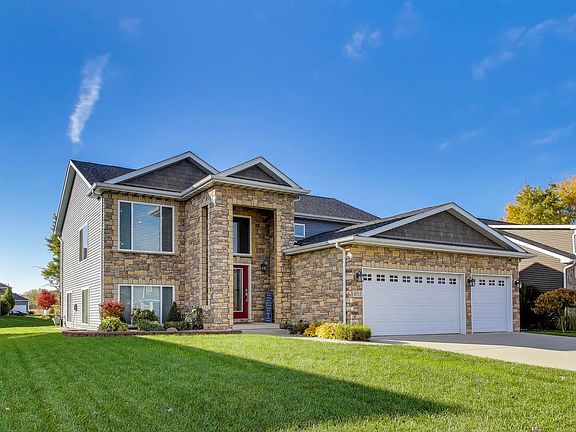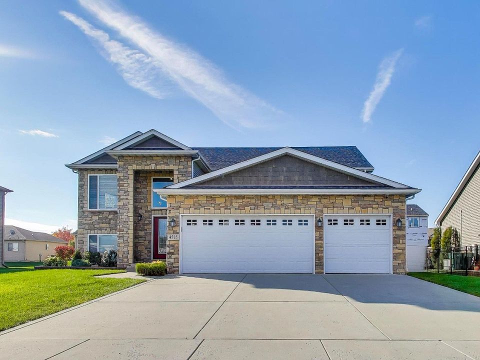 Beautiful 4-bed, 3-bath home with open floor plan, cathedral ceilings, recessed lighting, and ceiling fans. The kitchen features a large breakfast bar, birch wood cabinets with soft-close drawers, quartz countertops, stainless steel appliances, custom wine rack, and built-in beverage cooler. Primary suite with whirlpool tub, sit-down shower, double vanity, and walk-in closets. Lower-level great room with carpet and fireplace. Enjoy 3-car garage, two-zone furnace & A/C, solar panels, irrigation system, invisible pet fence, Bluetooth bathroom speakers, deck with gazebo, and storage shed. Modern upgrades and luxury features make this Merrillville home a must-see!