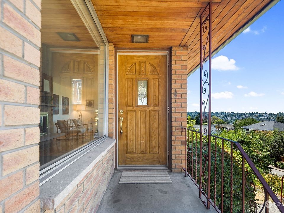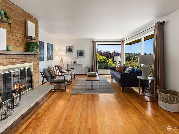Mid Century Modern oozing with potential tucked on a quiet street between Fremont and Phinney Ridge. Perched up high on a 6,000sf corner lot with panoramic Mountain and even some water views while enjoying maximum privacy. The main flr features a living room w/ hardwood flrs, fireplace and big view windows, formal dining room and eat-in kitchen with access to the rear patio and backyard. A full bath and three generous sized bedrooms with hardwood floors also serve this level. Opportunity awaits in the lower level daylight basement. Cozy wood paneled family room with fireplace, 3/4 bath, laundry and loads of storage. Ample space and high ceilings make this ripe for a remodel. Attached 1 car garage off the alley.