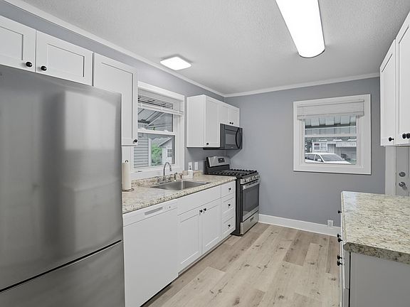 Fully Updated Home with Modern Comforts! Step into this beautifully renovated 2-bedroom home featuring new finishes throughout such as vinyl flooring, plush carpeted bedrooms, and fresh paint inside and out. The kitchen has been completely updated with new cabinets, new appliances including a dishwasher and garbage disposal. Kitchen even features a pantry! The bathroom has had a total remodel complete with slick features and a contemporary design. There is a full unfinished basement that has been dry painted and provides plenty of storage room. 1.5 car detached garage has been fully drywalled. Home also features an adorable front covered porch as well as a spacious back patio. Additional updates are 90+ furnace with a/c, LED lighting throughout, ceiling fans, new water heater, and a durable metal roof.