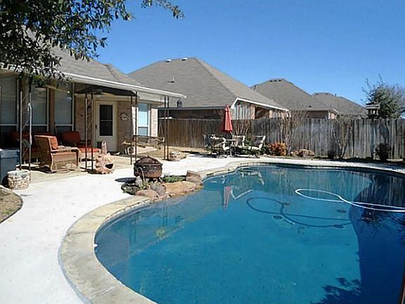 Lovely home with pool. Open floor plan. 2 inch blinds and ceiling fans throughout. Split bedroom layout. Large living room, gas fireplace & covered patio with flagstone floor. Across from elementary school, amenity center with water slides, playground, & clubhouse. Easy access to Toll and other freeways. Short distance to walking trails & Harmony School of Innovation. Home warranty provided, minerals convey.