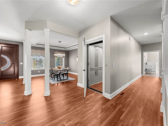 Welcome to this stunning custom-built ranch in the highly sought-after Eastwicke Farms neighborhood. Meticulously maintained and designed for luxury and accessibility, this home combines timeless elegance, thoughtful design, and modern comfort. A pair of grand double entry doors opens to an inviting foyer and elegant formal dining room with a statement light fixture. Luxury laminate flooring flows throughout the main living areas, including a spacious great room with a tray ceiling and abundant natural light. The adjacent chef’s kitchen features maple cabinetry, granite countertops, stainless steel appliances, and a large island with seating for three. A two-sided fireplace warms both the kitchen and the sunroom, which is filled with windows and offers beautiful views of the backyard — complete with a paver patio, custom waterfall, and lush outdoor space. A covered patio accessed directly from the kitchen provides the perfect spot for outdoor dining or quiet relaxation. The backyard oasis is designed for enjoyment and entertaining, showcasing a paver patio with a custom waterfall, aluminum fencing, and green space ideal for gardening or outdoor activities. The primary suite is a true retreat, featuring two walk-in closets with built-in organizers and a spa-style bath with dual vanities and a zero-threshold walk-in shower with built-in seat. Two additional bedrooms, a full bath, half bath, laundry room, and 2-car garage complete the main level. A centrally located elevator ensures seamless access to the finished lower level, which includes a large recreation room, a bedroom with full bath, a bonus room with cedar closet, ample storage, and walk-out access.