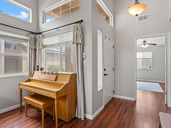 Wonderful Longford home located in the Crystal Ridge of the Paradise East community. Home features 2,001sf with 3 bedrooms, 2.5 bathrooms, an office and a 2 car garage. Step into the front living area with upgraded laminate wood floors and soaring ceilings. Remodeled kitchen with sleek white cabinetry, quartz countertops, backsplash, stainless steel gas range, microwave and dishwasher. Open main living area perfect when entertaining. Upstairs find the spacious owners suite with an accent wall, private balcony and bath. Bath hosts dual sinks, large soaker tub and a walk-in shower. Great backyard, fully fenced with a covered and open patio and shed.