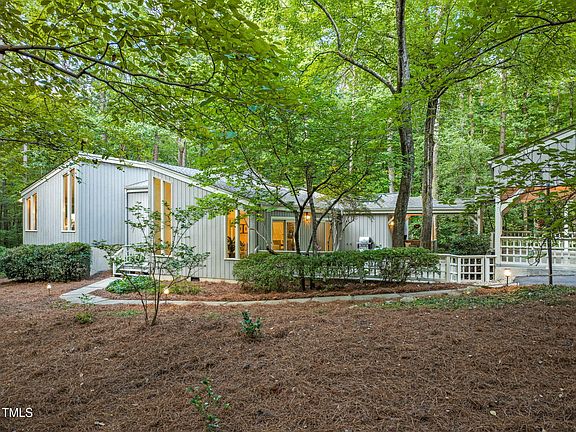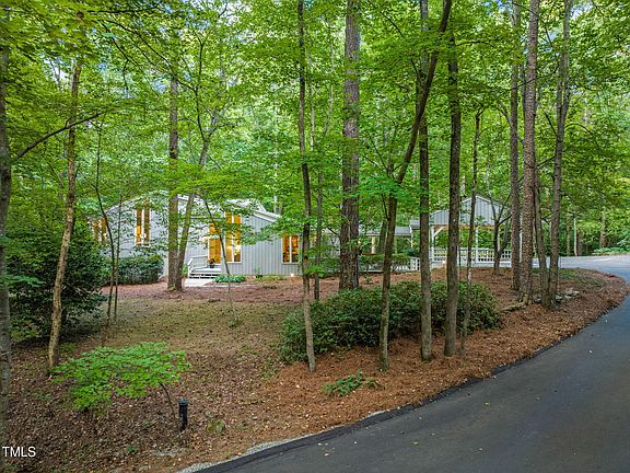 An exceptionally rare and highly desirable home awaits on a private parcel of land backing onto acres of Army Corps of Engineers property, stretching south of Old Chapel Hill Road and north of Highway 54. A long, winding driveway meanders through the woods, leading you to this remarkable retreat. From the sturdy, well-built carport to the numerous decks designed for entertaining family and friends, every detail of this home emphasizes privacy and natural beauty. Inside, the home has been refreshed with new carpeting and chic paint, making it truly move-in ready. The family room showcases handsome wood paneling, while expansive windows in nearly every room frame serene wooded views, filling the home with peace and light. For the young explorers, the property provides endless opportunities - hours of adventure await as they carve out trails and discover the joy of hiking through the acreage. The seller of 4519 Chicopee Trail reserves the right of first refusal to sell the adjoining parcel at 4515 Chicopee Trail to the buyer of this home. Offers on the land may be considered prior to acceptance of an offer on the residence. This rare offering is a true treasure—one that blends privacy, beauty, and investment value. Don't miss the chance to make it yours.