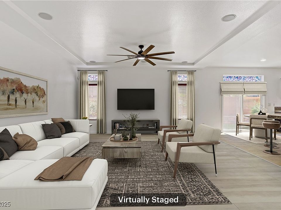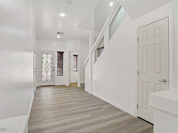 Mortgage savings may be available for buyers of this listing! Located in a highly sought-after Southwest neighborhood, just minutes from premier shopping, entertainment, freeway access, and the Las Vegas Strip, this stunning three-story home offers the perfect blend of style and convenience. Featuring a popular floorplan, the home boasts brand new luxury vinyl plank flooring and brand new carpet throughout, complemented by a fresh coat of paint. The kitchen is equipped with elegant granite countertops and walnut stained cabinets, while the living areas are enhanced with surround sound and ceiling fans. Enjoy the luxury of granite shower surrounds, two spacious lofts ideal for work or play, and energy efficiency with a fully installed solar system. The cozy backyard is perfect for relaxing, complete with a covered patio for year-round enjoyment.