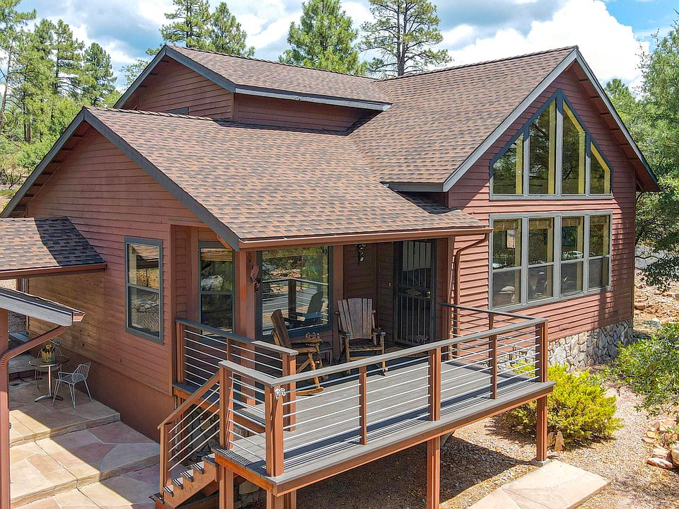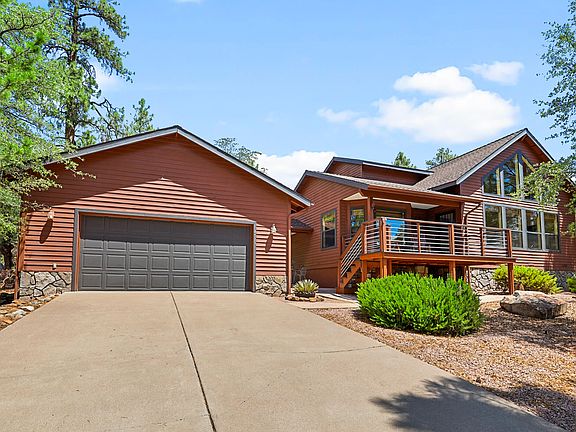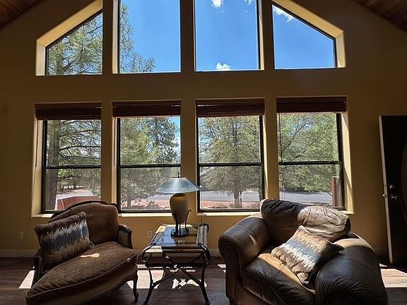 This beautiful home is nestled in one of Pine's most sought-after subdivisions, Portal 4, offering fine appointments throughout and fantastic mountain views. The open, airy living room features soaring tongue-and-groove vaulted ceilings, a cozy gas fireplace, and large windows that fill the space with natural light. The kitchen boasts abundant cabinetry, a pantry, granite countertops and new stainless steel LG ThinZ appliances. Including a refrigerator, oven, build-in microwave and dishwasher, plus two built-in lazy susans for added convenience. The adjacent dining area is surrounded by windows, allowing you to enjoy the views with every meal. A large main-level bedroom with an upgraded bathroom, complete with granite counters, provides convenience and comfort. Upstairs, the primary bedroom with en-suite, has granite counters, a relaxing jetted tub and amazing views of the Rim. Enjoy outdoor living on the covered front deck or the expansive back deck, perfect for entertaining while taking in the stunning scenery and abundant wildlife. Come relax and enjoy with many recent major updates to give you peace of mind: freshly painted interior and exterior, new roof, new front deck, new flooring and baseboards, new HVAC, water heater, toilets, updated lighting and ceiling fans and complete crawl space insulation. Additional features include a fully finished oversized two car garage. Most furniture conveys, making the home truly move in ready! Don't miss this opportunity to own a slice of paradise, whether you are seeking a full-time residence or a charming mountain get-away.