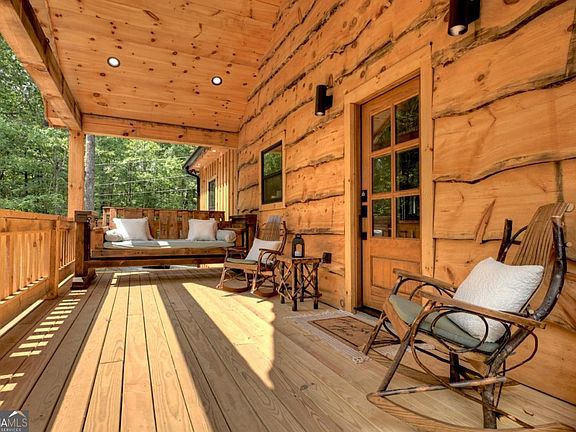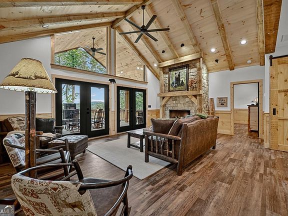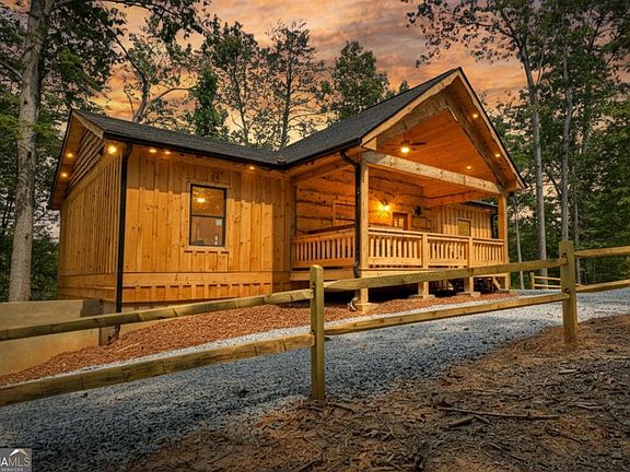 NEW CONSTRUCTION - Welcome to "Black Bear Pine Retreat" - Perfectly situated on 2.48 ACRES with a protected long range MOUNTAIN VIEW of the Cohuttas, this brand-NEW custom cabin blends rustic charm with luxury detail at every turn. Step inside to soaring cathedral ceilings with exposed beams and pegs for a true timber-frame feel, anchored by a stunning 12' Tennessee fieldstone fireplace with a craftsman beam mantle. The thoughtful design continues throughout with layered trim, live-edge accents, custom wainscoting, and tailored cedar closet systems. The primary suite offers a clever pass-through to the laundry area, while the kitchen showcases shaker cabinetry, chiseled cream granite, tumbled travertine backsplash, GE appliances, and a walk-in pantry. A full unfinished basement (plumbed for expansion to include bath, kitchen, & radon) & framed to accommodate a garage if desired. Outdoors, expansive party porches with rough-sawn timbers, live-edge details, and a wood-burning fireplace create the perfect gathering spaces (already pre-wired and supported for a hot tub). Practical features include tankless water heater, city water, generous parking with level driveway & split rail fencing, and short-term rental eligibility. Located in a popular river resort community, with numerous amenities & where ATVs, golf carts, and side-by-sides are welcome (w/permit). Private yet convenient, this property offers both an inviting retreat and a smart investment.