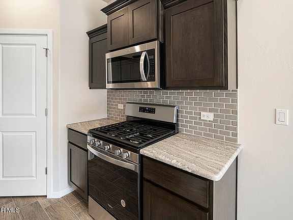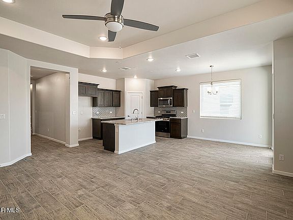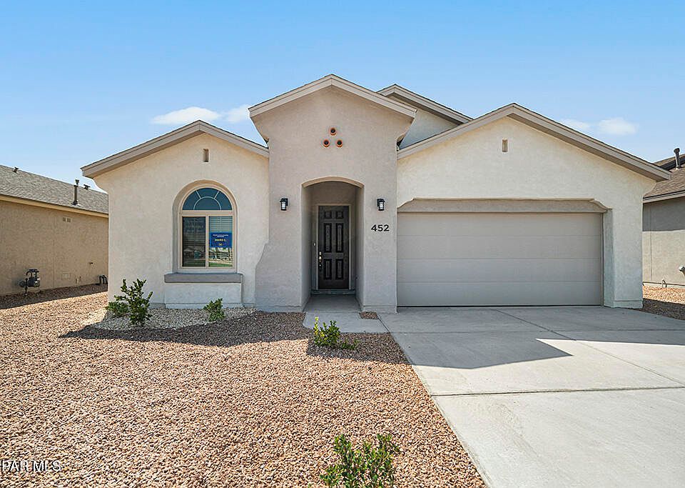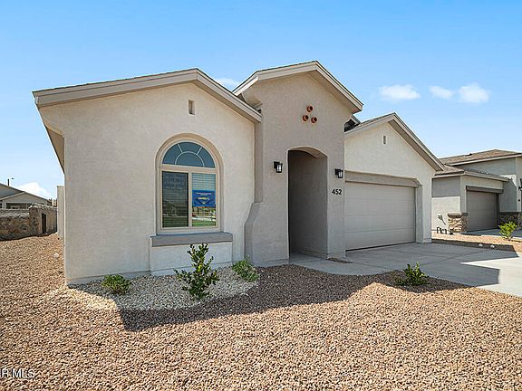 See this move in New Construction home. Discover the epitome of modern living in the heart of Sunset Valley Estate in Socorro. This beautiful property features 3 bedrooms, 2 baths, an extended patio, and a 2 car garage. The inviting entryway leads to a spacious kitchen with stainless steel appliances, great room, and dining space that are bathed in natural light from an abundance of windows. The dining area opens to a covered patio, perfect for entertaining guests. With ample storage and a large utility room, convenience is never far away. The generous masters suite features dual vanities, a relaxing tub and show combo and an expansive walk-in closet in the master suite for those looking for great