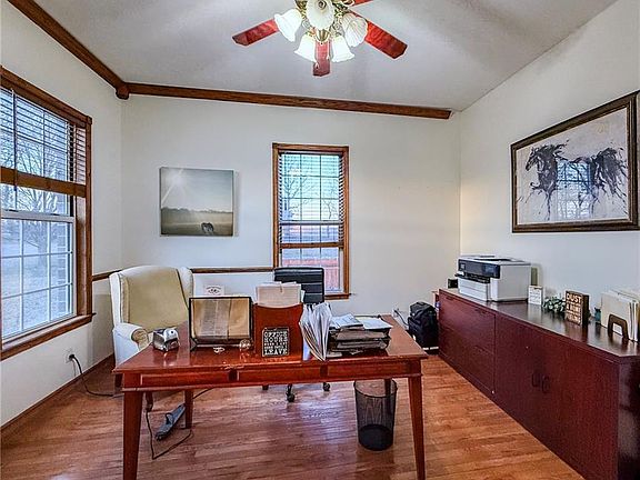 Step inside to discover the beauty of natural sunlight streaming through large windows, highlighting the rich hardwood floors throughout. The gourmet kitchen is a chef's dream, complete with granite countertops and a center island, ideal for cooking and entertaining. A formal dining room and dedicated office space provide functional and elegant areas for work and gatherings. The four-season room is a perfect spot to relax and enjoy the views of the picturesque surroundings. Home is on city water and city sewer and has a water softener and storm shelter in the garage.