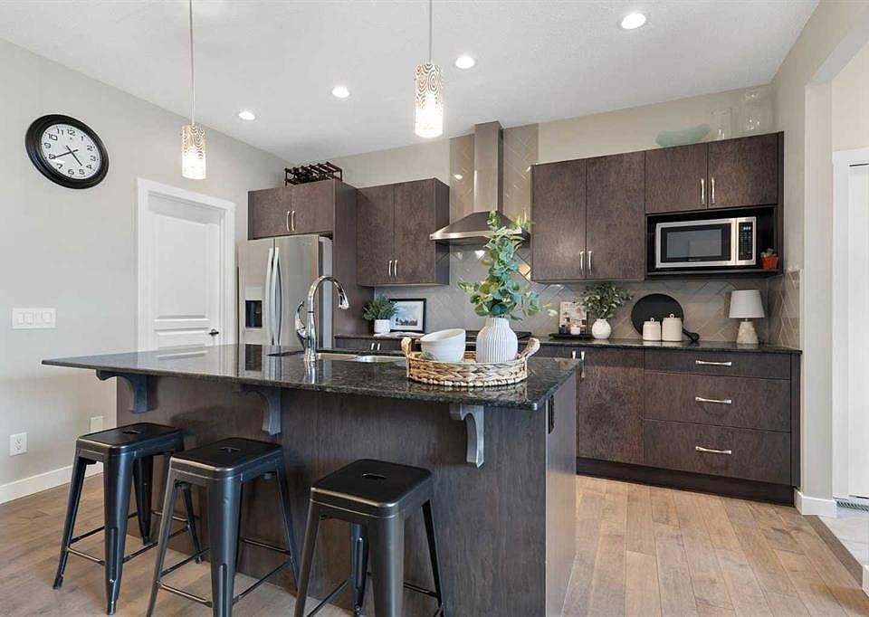 Hello Gorgeous! Welcome to Hillcrest! This custom detached home is beautifully designed with thoughtful upgrades across all three levels, offering over 2,300 sq. ft. of fully developed living space. From the moment you step inside, you’ll notice the attention to detail that makes this property both stylish and functional. The main floor spans over 805 sq. ft. and features engineered hardwood flooring, with tile in the bathroom for durability. A private office with glass French doors is perfect for working from home, while the living room is anchored by a sleek electric fireplace for cozy evenings. The kitchen will impress with granite countertops, a gas range, stainless steel hood fan, fridge, and dishwasher—blending elegance and practicality for everyday cooking or entertaining. Upstairs, you’ll find three generously sized bedrooms each offer spacious walk-in closets, while the bathrooms boast tile flooring, granite countertops, and an upgraded main bath complete with an extended soaker tub and glass shower, plus upgraded carpet throughout. A convenient second-floor laundry room, equipped with a brand-new Samsung washer and dryer, makes everyday chores a breeze. The fully developed basement adds another 711 sq. ft. of versatile living. Finished with laminate flooring, it includes a built-in bookstand, electric fireplace, and a wired entertainment area ready for your home theater setup. A large office space, plus a full secondary kitchen with quartz countertops, microwave, and fridge, expand your options for hosting or multi-generational living. The basement also includes a spacious closet, ample storage, and a full bathroom finished in tile. Outside, enjoy both a composite rear deck and a lower wood deck overlooking the green space, complete with a fire pit for outdoor gatherings. The extended garage provides excellent storage and easily accommodates two large SUVs or trucks. This property combines custom craftsmanship, modern finishes, and flexible living spaces—making it an incredible place to call home. Hillcrest is a fantasic family-friendly community - this home is surrounded by walking paths, parks, playgrounds, and stunning mountain views. Everyday conveniences are just minutes away with schools, shops, dining, and quick access to Calgary all within easy reach. Hillcrest combines modern amenities with small-town charm, making it the perfect place to put down roots — book your showing today!