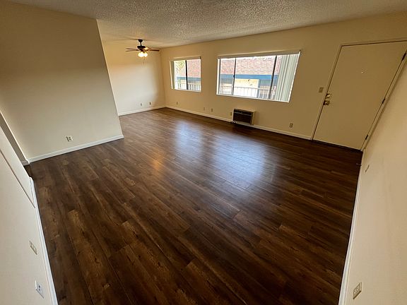 The apartment is equipped with a wall furnace, wall air conditioners, and a ceiling fan. Features include a walk-in closet, laminate flooring, and ceramic tiles. Amenities include a shared laundry facility.
