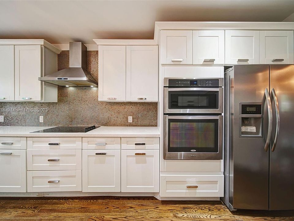 Completely remodeled with beautiful kitchen with quartz counter tops and stainless steel high line equipment! 3 spacious bedrooms, office with high wood ceilings,family room and open beamed vaulted ceilings. New modern bathrooms, quartz tops and elevated sinks! Stunning wood floors throughout. All impact windows, full glass french doors lead out to a beautiful trellis back paver patio. Enlarged paver driveway for 2 cars. Must see!