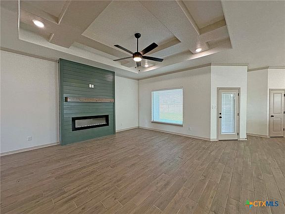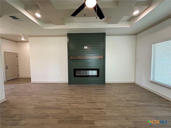 The family room is a large open design with plenty of natural lighting, beamed ceilings, and an electric fireplace offering a perfect space to relax, unwind, and create lasting memories.