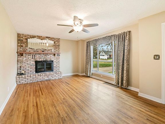 - Fireplace features: Brick, Circulating, Living Room, Wood Burning