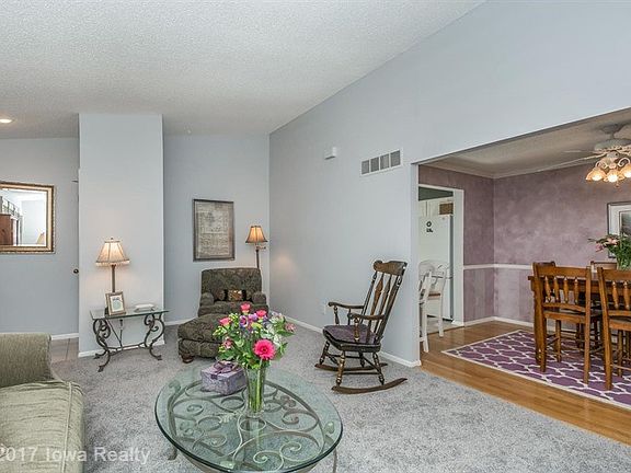 Bi-attached, 4 level split, assessor shows this as a ranch. 1605 sq feet of finish. White kitchen cabinetry with porcelain tile floor, breakfast bar, plus extra wall of cabinets. All appliances stay. Formal dining room with hardwood flooring, crown molding, chair rail, and special paint. Spacious vaulted living room, new carpeting, shuttered window wall. 2 bedrooms up, full hall bath. Master bedroom with walk in closet and 3/4 bath. Family room level walks out to private rear yard. 23x12 patio plus 34x14 deck, treed area beyond deck. Family room with gas fireplace, additional 3rd bedroom or office. Also 3/4 bath on this level. Non-conforming 4th bedroom, laundry and storage on basement level. Washer and dryer stay. This home is in Johnston School district. Lives like a townhome with no HOA fees. Upgraded 7 Star warranty. This lovely home won't last!