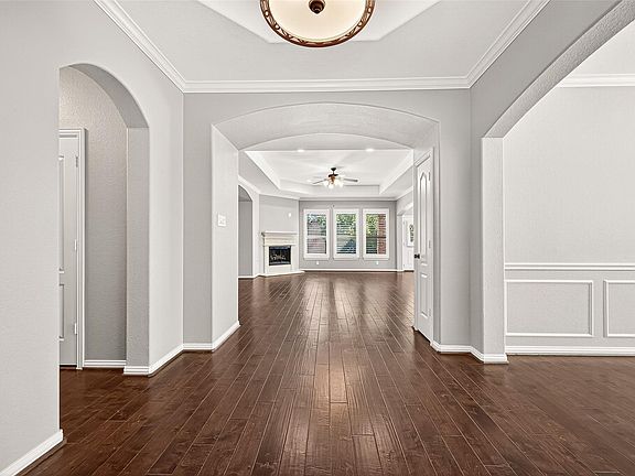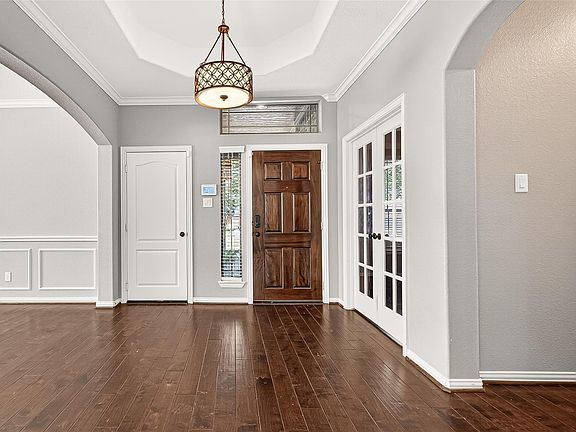 Lovely one-story home in the highly sought-after Country Lake Estates! This move-in-ready gem offers 2,292 sq. ft. of timeless style with 4 bedrooms, 2 baths, and a formal dining room, one of the bedrooms, with its French doors, can be easily used as home office. Step inside to a spacious open concept layout with beautiful wood flooring, high tray ceilings, elegant archways, and plantation shutters that create a warm and inviting atmosphere. The kitchen impresses with stainless steel appliances, a gas cooktop, granite countertops, and abundant cabinetry. The primary suite provides a peaceful retreat with two walk-in closets, a soaking tub, and a separate shower. Enjoy outdoor living in this four-sided brick home featuring a covered patio, generous green space, and a spacious front porch. Ideally located near one of the community lakes with access to walking trails, pool, tennis courts, and parks, and just minutes from I-45, 99, top-rated Klein ISD schools, shopping, and dining.