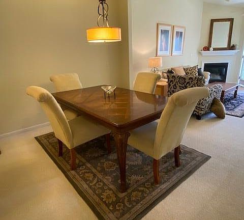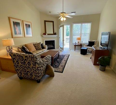 FULLY FURNISHED - available 1/5/26. Third floor, 2 bedroom, 2 full bath condominium convenient to ILM airport, Corning, and I-40. No pets. One year lease required. Target shopping center is close by. The unit boasts vaulted ceilings, a gas fireplace (tenant responsible for set up if desire to use), and a split bedroom floor plan. The galley kitchen is complete with all appliances, dining table and 2 chairs. The open floor plan includes a dining room table that seats 6. Relax on the leather sofa or the 2 side chairs. The private back deck has two chairs, a table, and a storage closet. The deck and spacious master bedroom have a view of the community pond and woods. There is an ample walk-in closet in the primary suite. The primary bathroom has a jet tub, walk-in shower, and extended vanity. The guest bedroom offers a full bed, dresser, and closet. Adjacent includes a full bathroom with tub/shower combo and laundry closet off the front hallway. The second bedroom photo shows a dresser that can be moved into the primary bedroom's large closet for additional storage if needed. Local owner and NC Broker/Realtor. This condo is part of a homeowners association so the community rules will have to be signed with the lease. Included in the rent are water, sewer, trash, 2 assigned parking spaces & a community pool along with a TV and most linens.