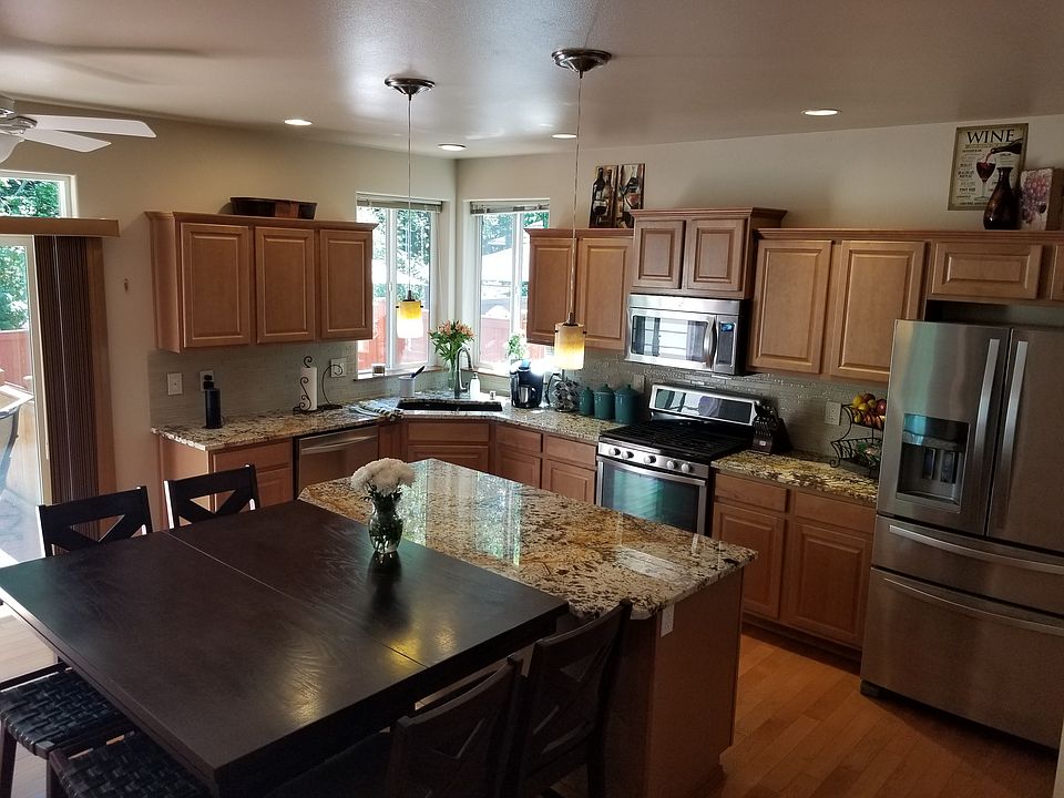 Move-in ready! Fresh paint throughout entire home. Beautiful wood floors, open concept kitchen with island, granite counters and stainless steel appliances. Cozy fireplace! Primary bedroom w/5-piece bath & 3 add'l large bedrooms up. Great work-at-home office plus open area upstairs w/desk space for homeschooling. Tranquil backyard paradise & entertainment-sized deck. Deck furniture included. Greenbelt on two sides makes very private backyard. Easy commute and no HOA. Professionally cleaned!
