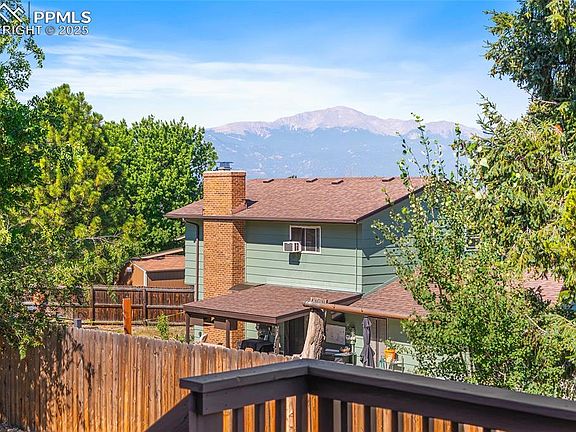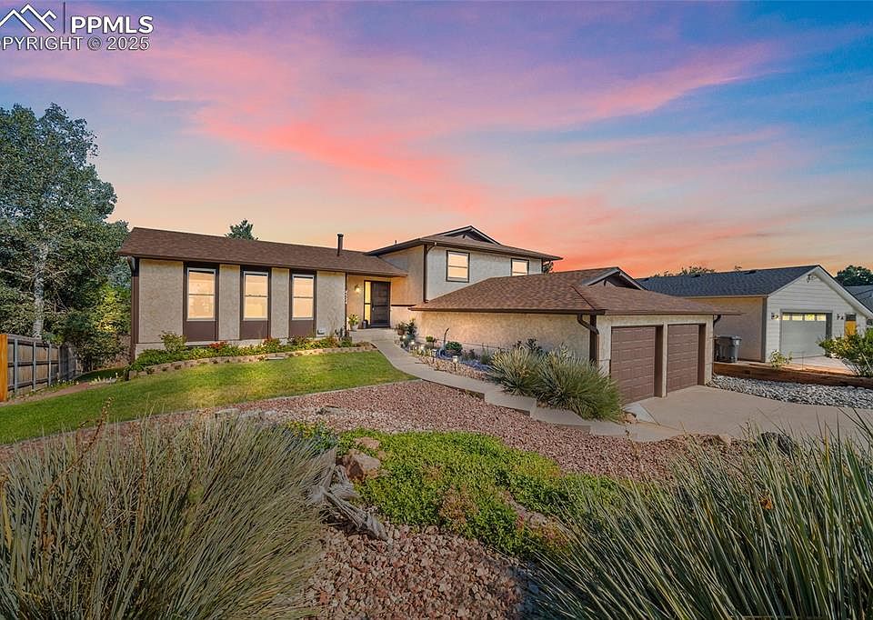 Welcome to this beautifully maintained 4 bedroom 3 bath home in the sought after Ridge neighborhood. This home provides the perfect blend of style, comfort, and convenience and a location that is accessible to work and play. The home features a light, bright, and open floor plan with beautifully stained wood beans, mid century modern details, vaulted ceilings, and large windows. And did I mention views! Pikes Peak and mountains can be enjoyed from the dining room, kitchen, great room, owners suite, and deck off of the great room. On the main level entertaining is easy in the large living room with connection to the formal dining room and kitchen. The classic style galley kitchen showcases updated stainless appliances, deep double kitchen sink, spray faucet, and pantry storage. In addition, an adjacent breakfast nook provides a second eating option. The oversize great room (22x16) with its full wall rock fireplace provides flexible options for furnishing. Just off the great room is the large deck with views of the mountains and access to the landscaped fenced backyard. On this level, you also have a large bedroom/office, 3/4 bath, laundry room with included extra large capacity W/D. On the upper level are two spacious bedrooms, a full bath, plus the owners retreat featuring a walk-in closet, private bath, and views of the mountains. The walk-out basement is unfinished and features rough-in plumbing, a workshop with built-in cabinets and radial arm saw. The beautiful front & backyard are landscaped for easy maintenance and include an irrigation system. Parking 2 cars + toys will be easy in the oversized garage. This home has been meticulously cleaned, and maintain by the original owners. Updates have been made to the HVAC, water heater, thermostat, humidifier, roof and gutters, deck, freshly painted interior and exterior trim, new shower enclosures, and lighting fixtures. This move in ready home is a great opportunity not to be missed!