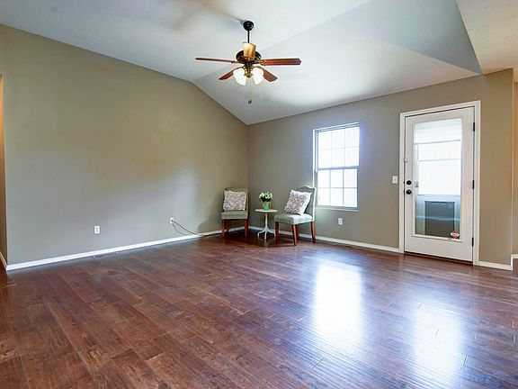 Don't miss this 3 bedroom 2 full bathroom charmer with popular open concept floor plan offering vaulted ceilings, engineered hardwood flooring, and lots of natural light. The kitchen boasts custom cabinets, granite countertops with bar top seating, stainless steel appliances, along with a pantry for added storage. The primary bedroom has an en-suite with granite dual vanity, two separate walk-in closets, as well as a walk-in shower. The two extra bedrooms plus full bathroom with granite countertop and shower/tub combo finishes out your one level ranch home. Other perks to this property include smart can lights in the kitchen and bathrooms, genie smart alarms on the windows for alerts, AT&T service with gigabit fiber, attached two car garage, and attic with pull down stairs for extra storage. You'll love the full wood privacy fenced backyard with patio, gates on both sides for easy access, large doggie door, and woods behind allow for privacy vs normal ''fish bowl'' feeling in most neighborhoods with neighbors looking in from all directions - ideal for spring BBQs and star gazing. This southwest location gives you the peace of being outside the chaotic hustle and bustle of midtown with the convenience of easy access to highways, restaurants, shops, Menards, and close to the new Target going in at Sunshine and West Bypass. Being built in just 2015, you'll love the modern updates and efficiency features on this low maintenance, move-in ready home - just waiting for you!