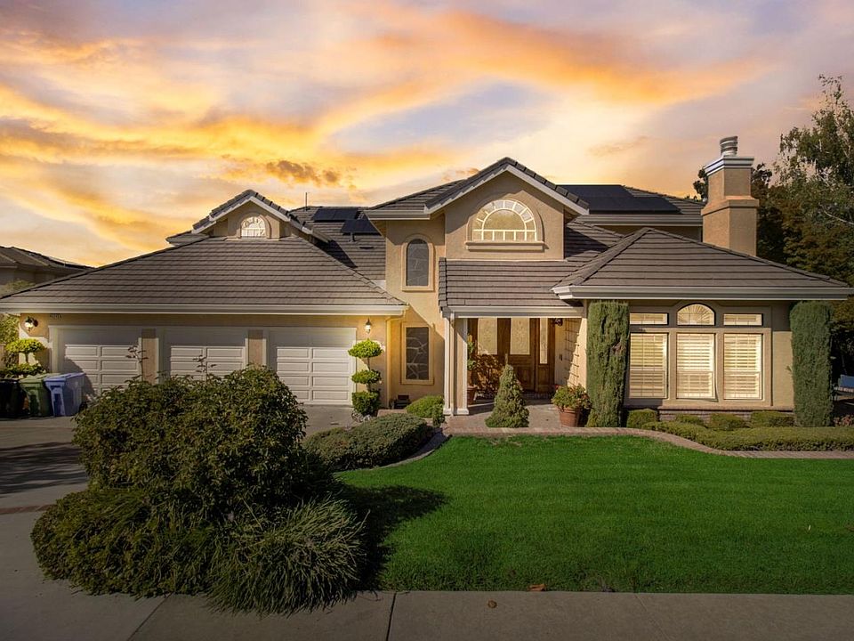 This luxury estate is in Vineyard Heights gated community by Mission Peak Trail. It's a custom-built beauty with cathedral ceilings, a grand chandelier, and spiral staircase. The living and dining rooms have french doors that lead to a shared courtyard. The family room has a wet bar that opens up to the chef's kitchen w/ all stainless appliances (installation soon) There are 4 bedrooms plus a library room/office and 3.5 bathrooms with a powder room plus indoor laundry. There are 3 fireplaces and impressive built-in wood bookcases and cabinetry throughout. Wake up to views of Silicon Valley and San Francisco Bay from your Primary Suite. The Jr. Suite is perfect for guests or extended family. The yard space is designed for fun for all ages. A huge open space with artificial grass in the children's play area and pergola over an outdoor seating area and BBQ dining space. The wood deck is complete with a jacuzzi. Over half an acre that's surrounded by mature trees and landscaping.
