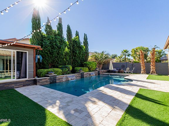 Your dream home awaits! This stunning 5-bedroom property offers a 3-car garage and beautiful desert curb appeal. Inside, enjoy high ceilings, wood accents, tile flooring, and an inviting great room with a cozy fireplace and sliding doors for seamless indoor-outdoor living. The chef's kitchen boasts granite counters, rich cabinetry, stainless appliances, pendant lighting, and a spacious island. The large primary bedroom has an ensuite with double sinks and a walk-in closet. You'll also love the dedicated theater room—perfect for movie nights! Outside, relax by the sparkling pool, entertain at the built-in BBQ with dry bar, and enjoy the charming mini-casita / she-shed.