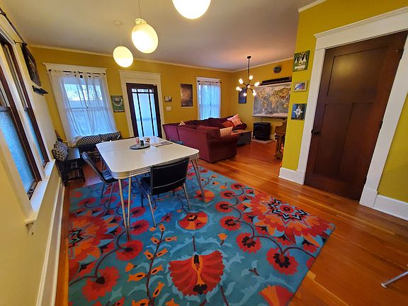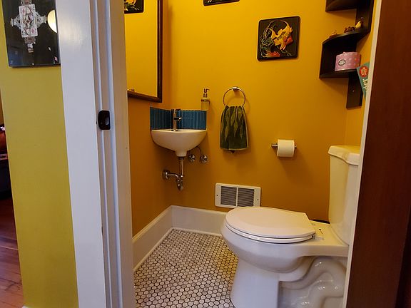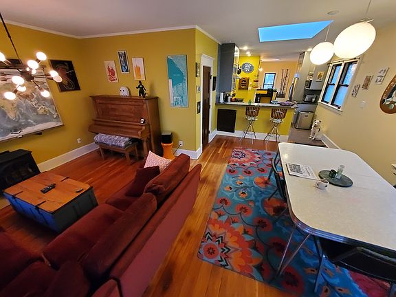 The space you'll be living in has a good size living room with a cozy gas fireplace and a dining room large enough to host dinner parties. The living room has a beautiful upright piano and a 50" TV with Roku. Between the living and dining room is a small powder room with a toilet and sink. The kitchen is well-equipped: gas stove, hood, dishwasher, large fridge, microwave, and toaster oven. Plus lots of appliances and ample counter space. The pantry in the kitchen is used half for food storage, and half for the brand new washer dryer. At the far end of the kitchen is an office nook with windows on two sides. Stairs off of the office nook lead downstairs, but there is a locked door separating the two units.