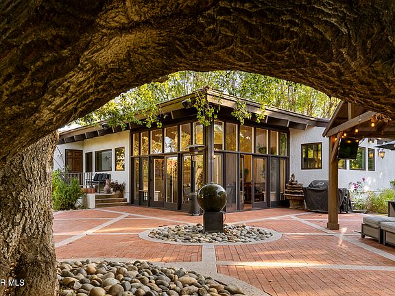 When the original developer of North Ranch chose his homesite in the mid 1980's, he chose 4525 Rayburn St. Dotted with majestic coastal oaks, the 29,000 SF property offered a unique serenity with a gentle rolling topography affording the architect/builder the freedom to create a genuine sanctuary. Nothing captures the spirit of man's interaction with the natural world than the one of a kind glass pyramid skylight located in the center of the soaring ceiling. The airiness and voluminous space intersect crisscrossing lumber beams, creating a sense of wonder and bliss. The tongue and groove wooden ceiling coupled with the afore mentioned beams, evoke man's connection to nature and the heavens, while the travertine floors anchor the soul to the earth. With more than 4,500 SF, including the sensational glass garden room or the detached 3 car garage/ gym and billiard hall, the space is all encompassing and engrossing. With the primary and a 2nd large ensuite on the main level, plus the kitchen, powder and open family room, this home lives easy and casual while the formal dining room is ready to meet any occasion. The lower level consists of two more bedrooms, a bath, laundry and an open entertainment room which could serve as bed 5 should your needs require it. Stepping through the main level French doors into the garden room, you feel the towering angular glass and wood ceiling, the walls of glass and used brick floor as a transition to the outside world. The yard is park like, with the sound of water cascading from the pool and its tiled water well and the walled yard features a gated circular driveway. The 3 car garage has been converted into a gym and fabulous pool hall replete with bench, barstools and pool table. Behind the garage is a small fruit tree orchard and gardening area. Additional amenities include remodeled baths, stunning millwork, both a built-in refrigerator and separate freezer along with top of the line appliances. Near the prestigious North Ranch Country Club, the finest shopping and both public and private educational opportunities, this gated estate suits everyone from the most down to earth to the most cosmopolitan. **Also available for lease furnished for $17,000/mo.**