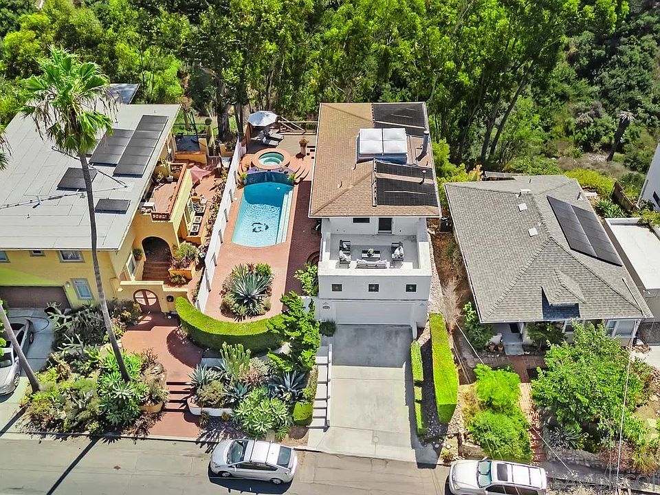 Nestled into the canyon's edge, this three-level contemporary home feels like a private retreat in the treetops! Flooded with light, the dramatic living area spans two stories with an Atrium style skylight. Views and decks on each levels and from every room, make this home so inviting... not to mention a pool and spa! Hardwood floors throughout. Modern kitchen with custom wood cabinetry and granite counters, and deck access for eating Al Fresco! Primary BR is the entire lower level with view deck, and a spacious BA with two vanities, soaker tub and a large walk-in shower. Freshly painted interior throughout. Pool heat is solar generated. Large view patio over the spacious 2 car garage! And a fabulous Cul-de-sac location in Prime University Heights!