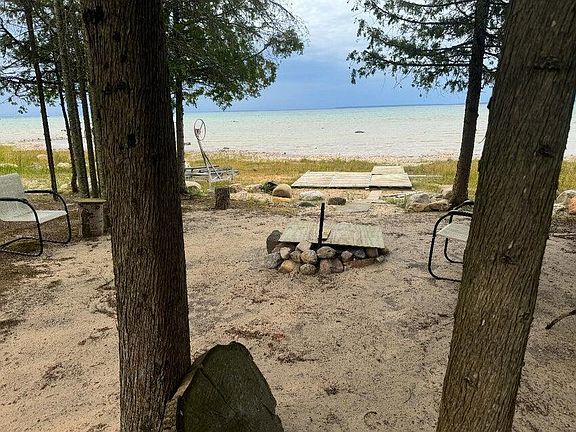 A unique opportunity to own 180 feet of frontage on Lake Michigan. Facing North situated between Trails End Bay and Cecil Bay, this property offers a panoramic view of the Straits of Mackinac. The surrounding nature allows for the privacy and tranquility of a retreat-like vacation we all want and need. Whether you're looking to maintain a quaint 1 bed cottage or build a dream getaway. This piece of land provides the foundation to make your vision a reality. Just 7 Miles from downtown Mackinaw City and 4 Miles from Wilderness State Park, it is not far from the attractions that make Northern Michigan a place to visit over and over again. Utilities: Electricity is hooked up to the Cottage and Shed. Perc test is underway to verify availability of water and septic with local providers.