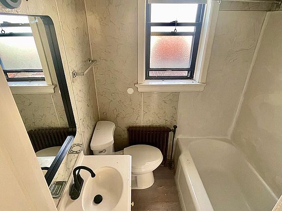 The apartment unit has newly finished vinyl flooring, brand new blinds, and a fresh coat of paint. The bathroom faucet, mirror, and shower head are also brand new. There is coin-operated washer and dryer in the basement.