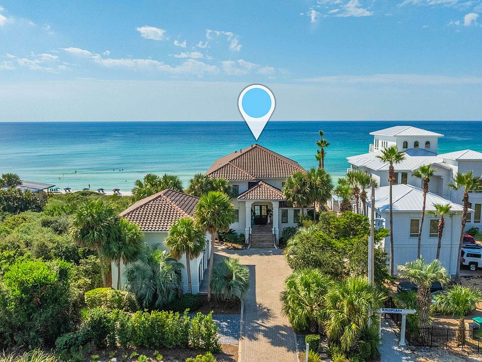 A Premier Opportunity to purchase an Extraordinary Gulf Front Estate With a Carriage House and 75 Feet of Private Beach Front on Scenic Highway 30A! This remarkable Gulf-front residence has multiple years of proven vacation rental income, with actuals, into the $700's and Sleeps up to 26! The breathtaking Gulf views from the Kitchen, Living Area, Dining and Bedrooms make this home spectacular! The gourmet kitchen is appointed with two refrigerators, and a massive breakfast bar, A commercial grade built-in ice machine is on the main as well as two large suites with ensuite baths. An expansive master suite and bath, private pool, and a carriage house with 2 bed/baths! Premium location at Hwy 30A/393 with an array of restaurants & shops available close by! Gorgeous past weddings and events!