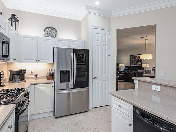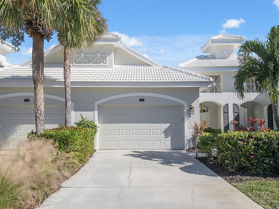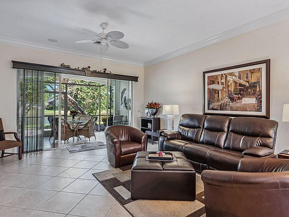Located in the award-winning community of Cardinal Cove in highly regarded Fiddler's Creek, this beautifully maintained villa offers the perfect blend of elegance, comfort, and tranquil lakefront living. Enjoy picturesque sunrise views from the expansive screened-in lanai, complete with in-ceiling speakers, an electric storm screen, and ample space for both dining and relaxation. Thoughtfully designed and meticulously cared for, this 1,539-square-foot home features two spacious bedrooms, two full baths, and a two-car garage. Inside, soaring 10-foot ceilings, crown molding, plantation shutters, and 18-inch tile flooring create a warm and inviting ambiance throughout the main living areas. The kitchen is a chef's delight, offering white cabinetry with under- and over-cabinet lighting, a pantry, natural gas cooking, and a new LG refrigerator. The open-concept living and dining area seamlessly flows to the lanai through sliding glass doors, while French doors lead to a charming front porch-offering multiple spaces to enjoy Naples' sunny weather. The owner's suite is a peaceful retreat with engineered wood flooring, a walk-in closet, and an elegant en-suite bath featuring dual vanities with marble countertops, a walk-in shower, soaking tub, and a high-end Toto toilet. The spacious guest bedroom, also with wood flooring, is conveniently located near a full bath across the hall. Additional highlights include a well-equipped laundry room with a storage closet, wall cabinets, and utility sink, plus a retractable screen in the garage. Every detail of this home has been thoughtfully curated for easy, stylish living. It's ideal for seasonal or year-round living. A rare feature that you will enjoy is having no other unit above you or below you, which provides for a free-standing, single-family home feel. Also, the Cardinal Cove village is in high demand due to its quaint feel, with only 44 residences, and a heated swimming pool solely for the village residents at the end of the street. Residents of Fiddler's Creek enjoy world-class amenities including a state-of-the-art fitness center with personal training and classes, an extremely active tennis and pickleball program, bocce, spa services, sauna and steam rooms, fine and casual dining, and a resort-style pool with poolside service. An extensive calendar of events, activities and parties adds to the vibrant social lifestyle. Optional memberships are available at The Golf Club, with no wait to join, and featuring a newly renovated championship course and a brand-new clubhouse, as well as The Tarpon Club for beach and marina privileges. Don't miss this opportunity to own a lakeside retreat with modern conveniences in one of Southwest Florida's most sought-after communities. Miles of sidewalks for walking, jogging and bicycling surrounded by stunning tropical landscaping. Perfectly located convenient to the beaches, boutiques, restaurants, golf courses, and executive airport of Naples and Marco Island.