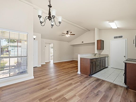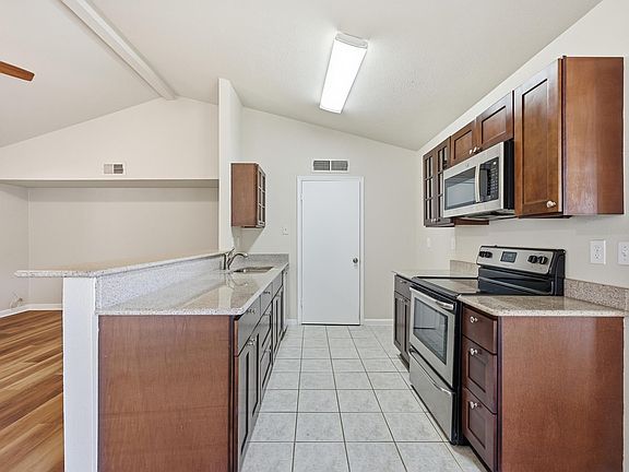 Step into the inviting living room with soaring vaulted ceilings and elegant wood flooring, perfect for relaxing or entertaining. The upgraded kitchen features sleek granite countertops, rich cabinetry, stainless steel appliances including an electric smooth-top stove, built-in microwave, dishwasher, and a deep, stainless steel sink.