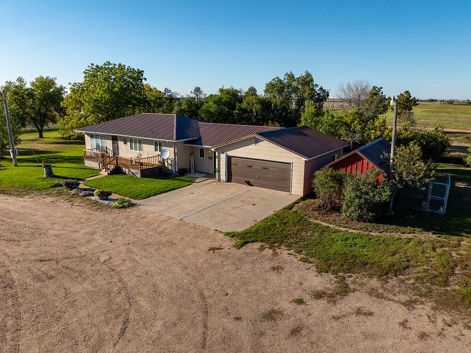 This bright and inviting 4 bedroom, 2 bath home sits on just over 5 acres and has so much to offer. You’ll love the peaceful setting with mature trees, a nice lawn, and a beautiful deck that’s perfect for relaxing or entertaining. The home features large, open living spaces with plenty of natural light. The main floor features a bright kitchen with a large living room, master bedroom with adjacent bath and laundry, another smaller bedroom and a guest bath. The basement has another living room, and two more non-conforming bedrooms! Recent updates include a newer metal roof (2021) and brand-new siding, giving the home a fresh look and extra durability. Outside, you’ll find a 40’x60’ Quonset with a concrete floor and electric— perfect for storage, a workshop, or hobbies. The door is large enough to accommodate a semi. There’s also a newer 40’x40’ livestock barn built in 2019 that is fully insulated with electric and a dirt floor that’s been used for show sheep and goats, but it would work great for horses or cattle too. This building also features a small tack or feed room with concrete floor. The property has multiple fenced pens and loafing sheds including one next to the red livestock shed with a concrete floor. A nice tree row provides shelter on the north from wind and snow. The well was re-drilled and the pump was replaced 3 years ago, as was the pressure tank. The head pump is a Carrier model and also was replaced 3 years ago providing peace of mind that major maintenance items have been covered. Conveniently located right off Highway 385 13 miles south of Julesburg, CO and 19 miles north of Holyoke, CO; this property offers the best of country living with easy access to town.