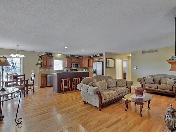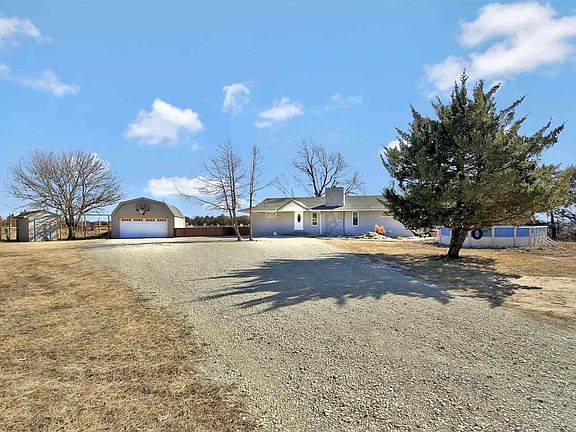 This is the country home you've been looking for! Only 20 minutes from Wichita! Spring is just around the corner and everywhere you look will be beautiful and green! Mature trees surround this property for added privacy. You will enjoy the apple trees and fully stocked pond. There is a new, above ground pool that has been dug down to around 6 ft deep! The detached, oversized garage is sure to be a hit with the extra workspace AND it has heating and cooling! Inside, the whole family will enjoy the open floor plan. The kitchen has beautiful newer cabinets, a raised eating bar and hard wood floors. This home is equipped with tinted windows on the North, South and West sides. Large basement family room with so many possibilities! New roof was put on in 2010. Call today to schedule your showing!
