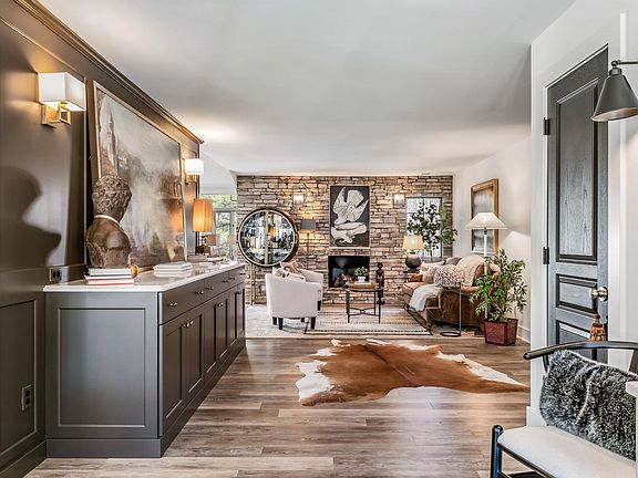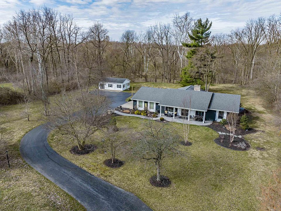 Nestled on the private end of West Hamilton Road South, you will find an impressive, custom home situated on three serene, private acres with a winding driveway, with private access to The Aboite Creek. This home underwent a full remodel in 2015 and 2016, and every design element has been thoughtfully curated. Highlights include Anderson 400 black windows, new siding, new and expanded front porch and sidewalk, exterior lighting, exterior security cameras, built-in home theater surround sound system, custom-installed whole-house sound system with additional outdoor speakers (perfect for patio parties!), network wiring, and new side and back patios. Plus, the property features a separate, 400-square-foot ready-to-finish guest cottage with roughed-in kitchen, bath, laundry, and attached 250-square-foot flex room, which is also framed for a single car garage with door onsite. Inside the main residence is a large foyer, an elegant formal dining room, and an awe-inspiring, eat-in kitchen boasting 11’ ceilings with tile reaching to the top. Two full-size dishwashers flank the kitchen sink and an impressive 10’ wall of windows overlooks your private patio and property. The kitchen includes a top-of-the-line full-size fridge & freezer, coffee bar w/ sink, wine bar with wine fridge — it’s an entertainer’s paradise! The butler’s pantry features a granite counter with integrated sink, gorgeous Portuguese wall tiles, a Venetian-plastered ceiling with crown molding, a second oven, beverage fridge, and a large closet with ample storage. Situated between the kitchen and formal dining room is a custom library wall with quartz countertop, plenty of storage for all of your entertaining essentials. The opulent & warm family room offers a stunning floor-to-ceiling, individually laid, stacked-stone wall with gas fireplace and sconces. The luxurious great room (encapsulated in a plethora of brilliant windows) and vaulted ceilings has an additional gas fireplace with custom built-in cabinetry and built-in surround-sound home theatre system to enhance your viewing and listening pleasure. The primary suite is spacious with his and her custom closets and a massive walk-in closet with bespoke, built-in shoe shelves for displaying up to 100 pairs of shoes. The timeless primary bath has dual vanities with quartz tops, polished nickel taps, sconces, a chic vintage cast-iron tub and a door leading to a private patio for morning coffee while being surrounded by an abundance of nature.