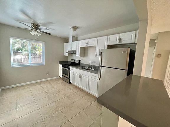 2BR/1BA lower end unit with newer cabinets, quartz countertops and tile floors. Stainless steel appliances and two tone paint. Window AC in living room and carpet in bedrooms. Complex is fully gated and laundry is onsite. 1 parking spot is included.